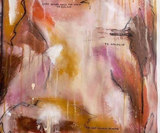 My process of creating is entirely intuitive. Using acrylic paint and other mixed media, I start by making a mark and responding to it. Instinctively choosing pigments, creating texture, line, layers and vulnerably sharing words from my heart.”